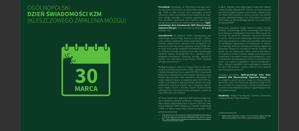 - Ogólnopolski Dzień Świadomości Kleszczowego Zapalenia Mózgu [KZM] jest punktem kulminacyjnym kolejnej edycji kampanii „Nie igraj z kleszcze. Wygraj z kleszczowym zapaleniem mózgu”. W ramach kampanii w całej Polsce prowadzone będą działania edukacyjne i informacyjne dot. wirusa i możliwości profilaktyki prowadzone w mediach i skierowane bezpośrednio do mieszkańców wybranych miast.