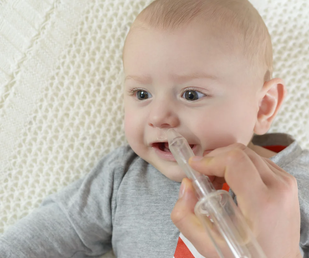 Przede wszystkim należy mu udrożnić nos. Połóż maluszka na plecach, odchyl jego główkę do tyłu i do każdej dziurki zapuść po 1–2 krople wyjętej z lodówki soli fizjologicznej lub morskiej (są dostępne w aptece bez recepty). To obkurczy naczynia krwionośne, zmniejszając obrzęk, i rozrzedzi wydzielinę. Przytrzymaj dziecko przez chwilę w pozycji leżącej, żeby krople nie wypłynęły. Potem ułóż je na brzuszku i poczekaj, aż wydzielina z nosa spłynie. Okolice noska delikatnie wytrzyj wacikiem i posmaruj maścią majerankową albo wazeliną – zapobiegnie otarciom i ułatwi oddychanie. Nos trzeba czyścić kilka razy dziennie, koniecznie przed karmieniem i snem. Aspiratorem możesz odessać nadmiar wydzieliny. Rób to delikatnie, by nie przestraszyć malucha i nie uszkodzić śluzówki nosa. Jeśli wydzieliny jest bardzo dużo, usuń ją za pomocą aspiratora dla niemowląt typu Frida lub innego z krótką szeroką końcówką. Przyłóż ją do zewnętrznej krawędzi noska. Nie używaj gruszki z cienkim zakończeniem, ponieważ łatwo uszkodzić nim śluzówkę. Kiedy niemowlę nie śpi, jak najczęściej kładź je na brzuszku – wówczas wydzielina będzie wypływała sama, udrażniając nosek.