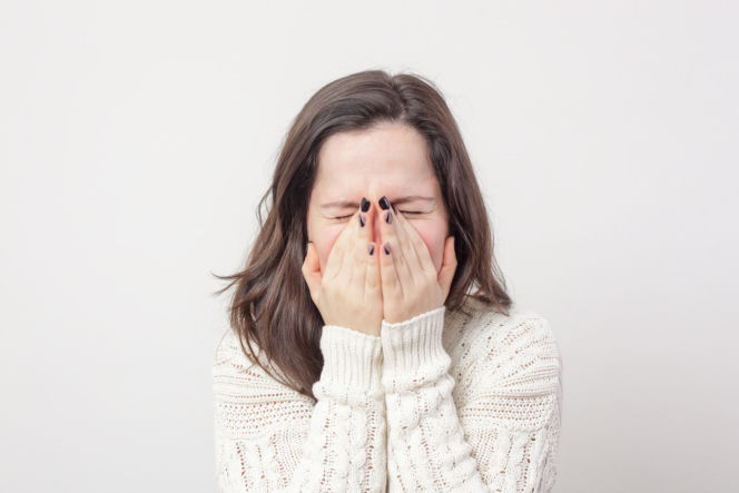 Młoda kobieta z długimi, ciemnymi włosami, w jasnym, dzierganym swetrze, zasłania twarz dłońmi, próbując stłumić kichnięcie, co może prowadzić do poważnych konsekwencji zdrowotnych. Więcej o tym, dlaczego nie wolno wstrzymywać kichania, przeczytasz na Poradnik Zdrowie.