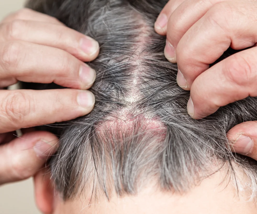 - obecnością na skórze głowy rumieniowo-grudkowych zmian, które typowo mają barwę żywoczerwoną,