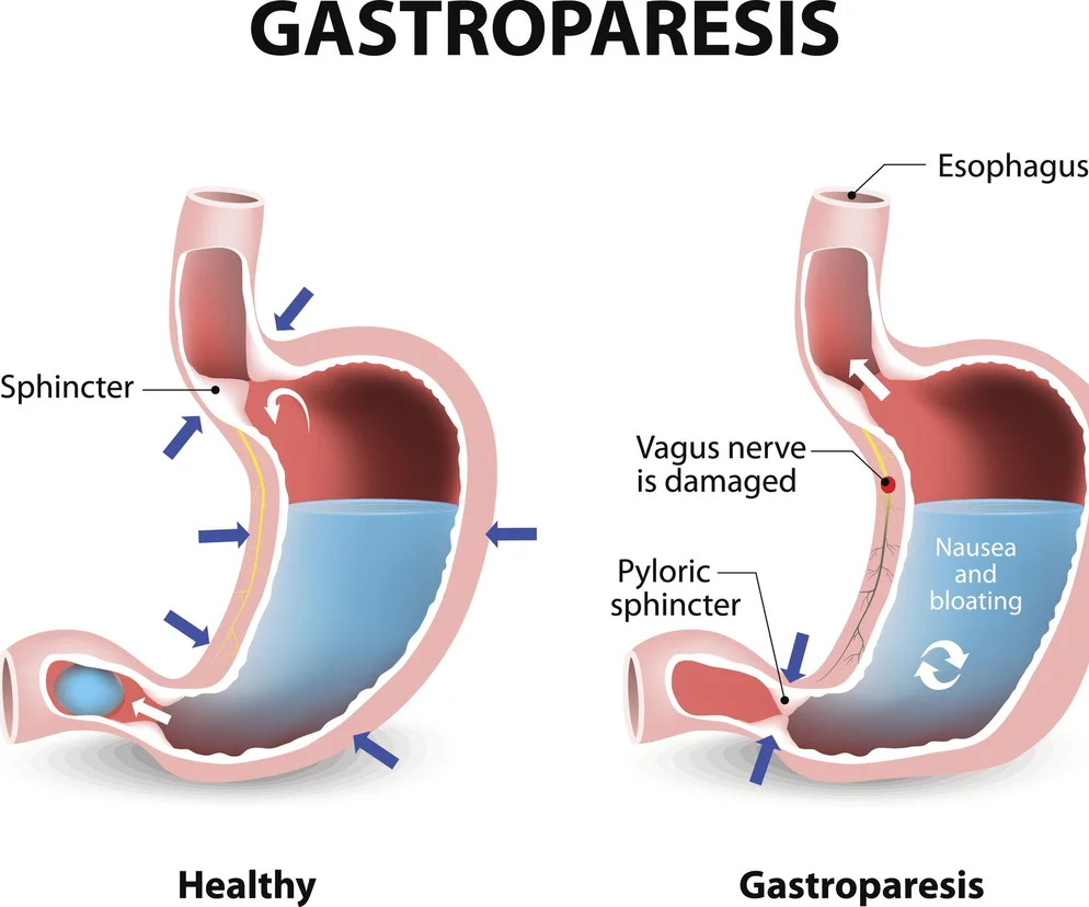 Gastropareza czyli zaburzenie ruchów perystaltycznych przewodu pokarmowego pojawia się w wyniku szkodzenia nerwów, powodujących nieprawidłowości w pracy mięśniówki żołądka. Następuje spowolnienie lub zatrzymanie przesuwania się treści pokarmowej z żołądka do dwunastnicy. Ściany żołądka ulegają rozciągnięciu i może dochodzić do tworzenia bezoarów, czyli nieprawidłowych struktur zbudowanych z niestrawionych resztek. Na skutek zwiększonej fermentacji pokarmu dochodzi do nadmiernego wzrostu bakterii. Przyczyny wystąpienia gastroparezy:
