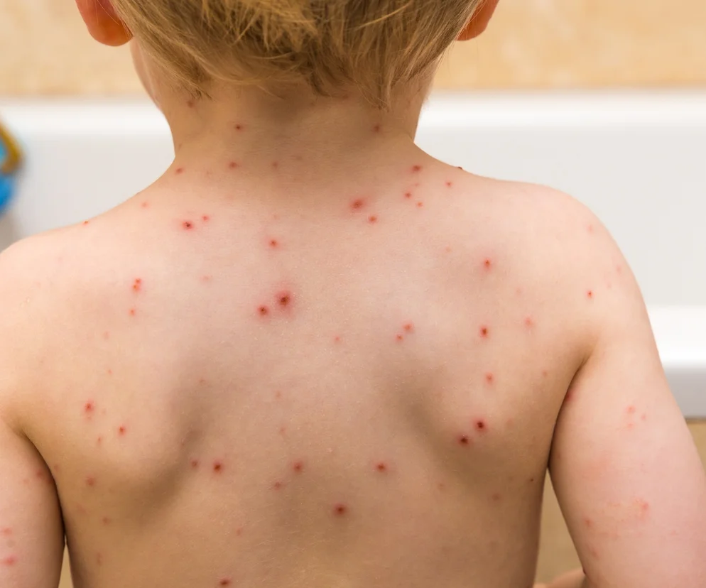 - po 2-5 dniach wysypka na całym ciele, błonach śluzowych i we włosach (początkowo czerwone, swędzące plamki, następnie grudki, które wypełnia płyn surowiczy)