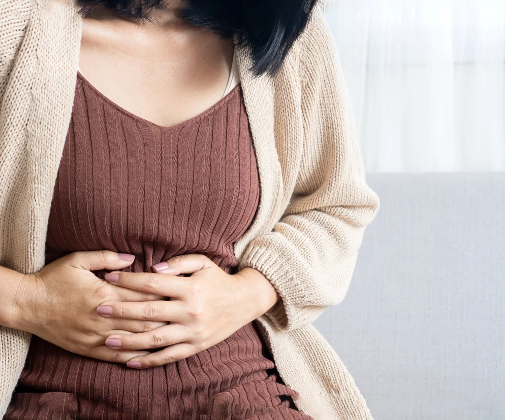 - wymiotami (często krwawymi)